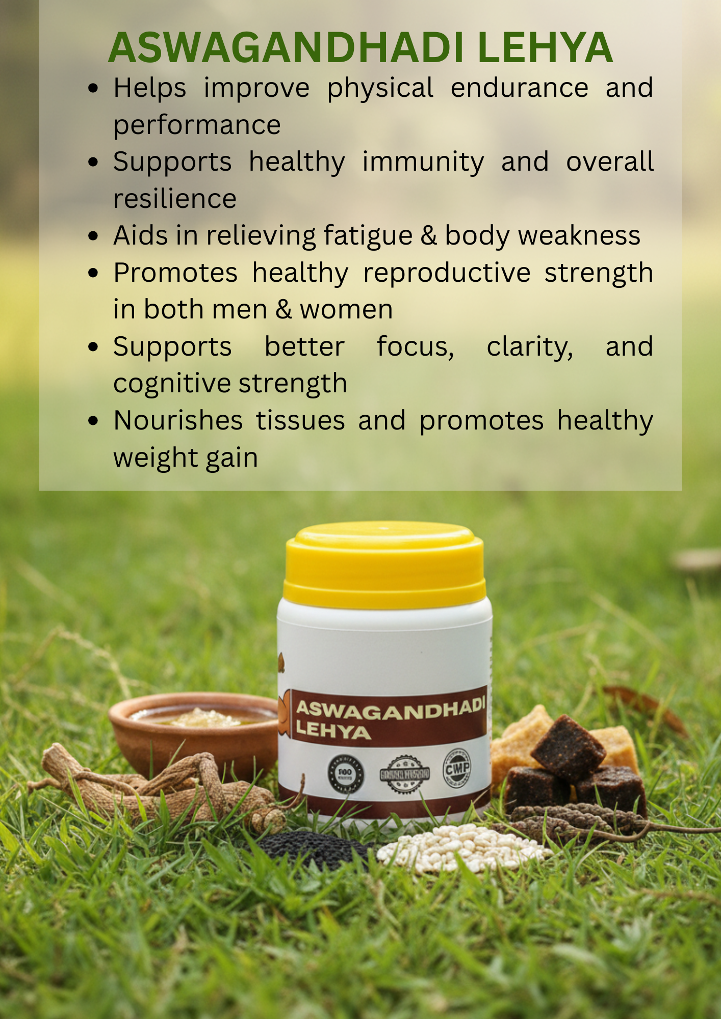 Ashwagandhadi Lehyam is a classical Ayurvedic rejuvenative (Rasayana) herbal jam mainly used to promote strength, stamina, and overall vitality. Its cheif ingredient Ashwagandha (Withania somnifera), is renowned for its adaptogenic and strengthening properties. This lehyam is commonly used to support nervous system health, reduce fatigue, boost immunity and enhance muscle strength. It is especially beneficial in managing stress, weakness, general debility and durning recovery from chronic illness.