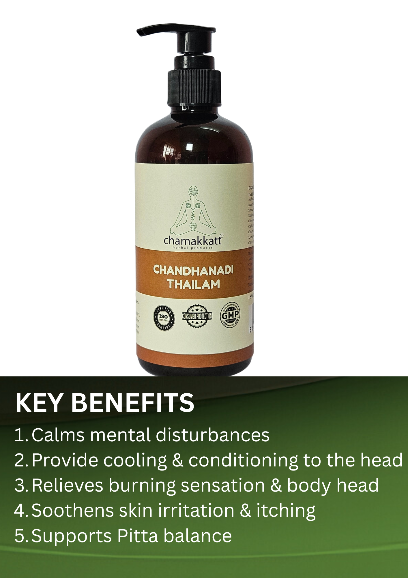 Chandhanadi thailam is a classical Ayurvedic medicated oil known for its cooling, soothening and anti-inflammatory properties. This oil is especially beneficial in conditions related to excess pitta such as burning sensation in the body, excessive heat, headaches and skin disorders.