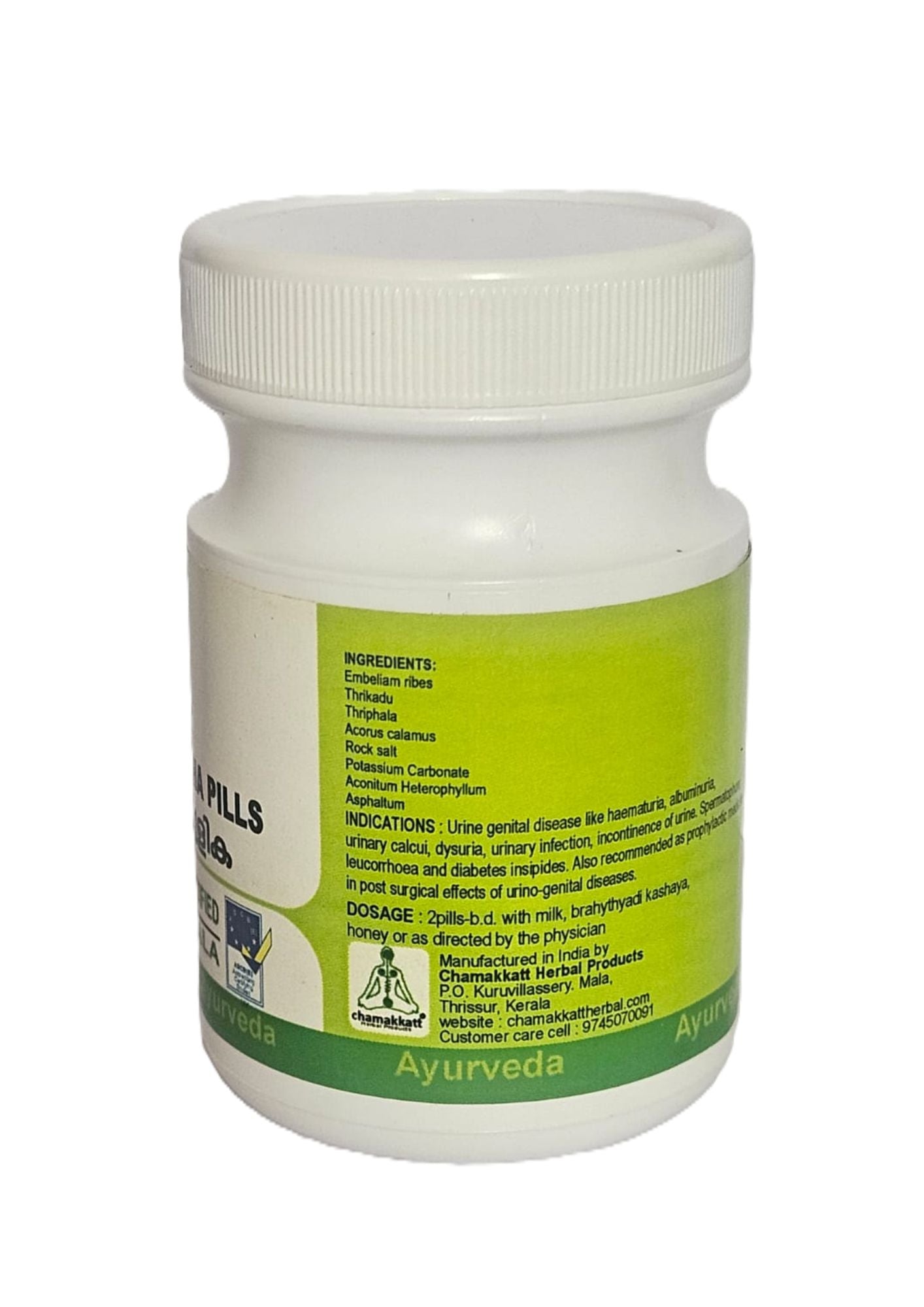 Key ingredients : Guggulu, Shilajit, Trikatu (ginger, black pepper, long pepper), musta, Haridra, Vacha, and several other herbs and minerals.