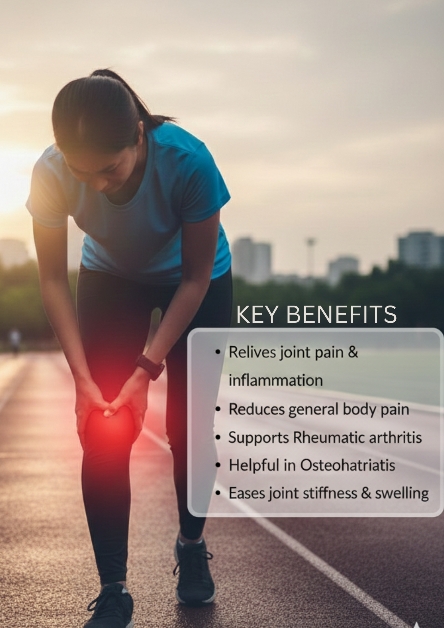 Indication: Joint pain with inflammation, Rheumatoid arthritis, Osteoarthritis, General body pain, Stiffness and restricted movement.