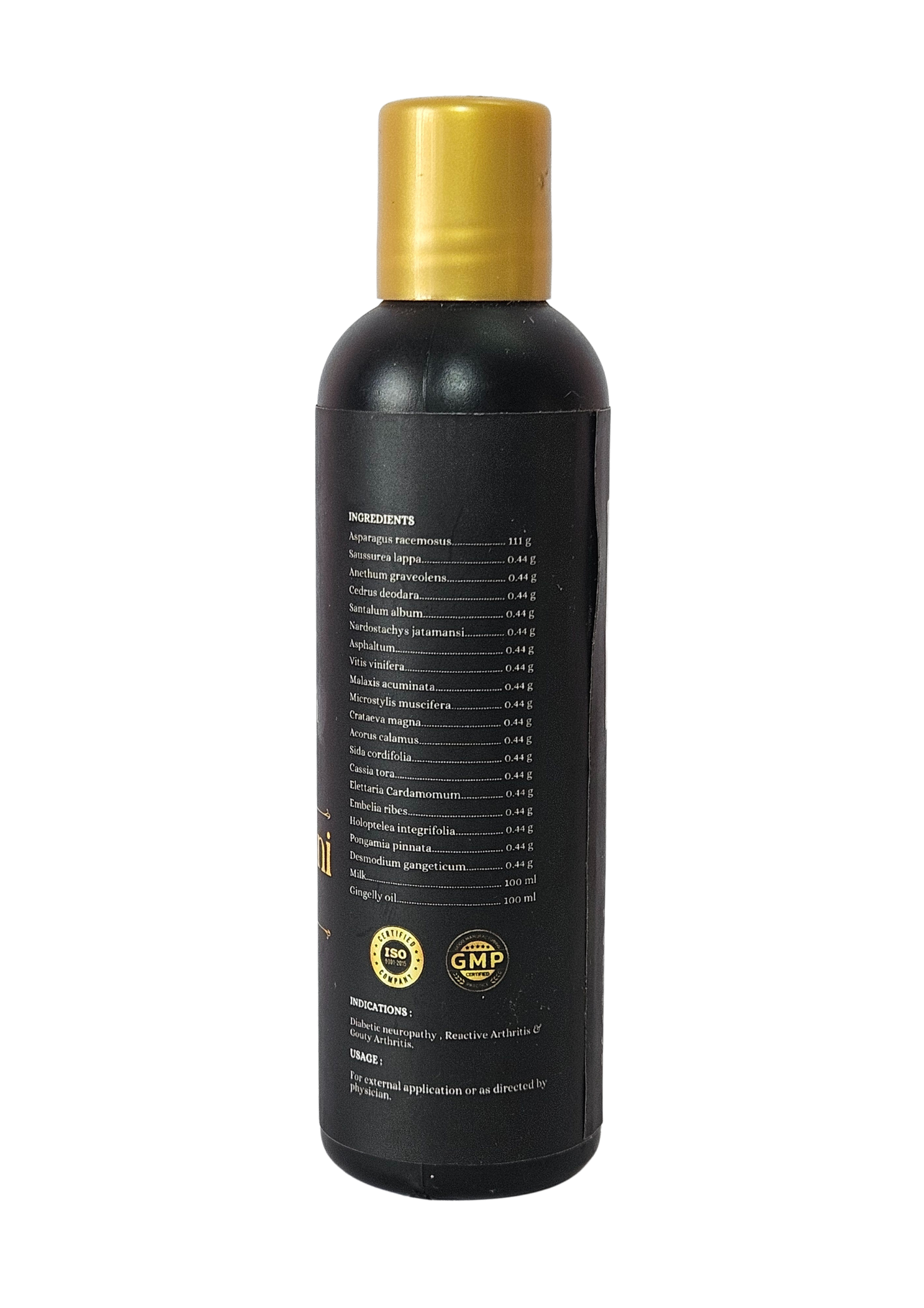 Vathashani Thailam is a specialized Ayurvedic oil formulated to address Vatavyadhis impacting the neuro-muscular and skeletal systems. It supports relief in conditions such as diabetic neuropathy, reactive arthritis, and gouty arthritis by targeting imbalances in Vata dosha. This therapeutic oil also aids in managing symptoms related to impotency associated with these disorders, promoting improved mobility and nerve function through its carefully selected herbal ingredients.